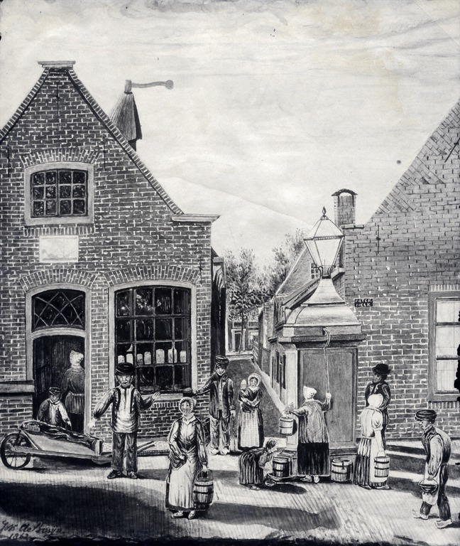 ‘In het pand van de schoenenwinkel was in 1820 het logement “Het Amsterdamse Veerhuis” gevestigd. Dat was toen al een oude naam, want het zeilschip op de gevelsteen geeft aan dat er in lang vervlogen tijden schepen werden gelost en geladen. Dat was mogelijk omdat er destijds een gracht, de Grobbe, midden door onze stad liep. Aan weerszijden daarvan lagen smallestraatjes. In de huizen woonden de burgers die van ’s ochtends vroeg tot ’savonds laat in de molens, de brouwerijen en de jeneverstokerijen werkten. Dat waren in Weesp in de achttiende eeuw de belangrijkste bestaansmogelijkheden.Daar hoorden ook timmerlieden, wagenmakers, kuipers, smeden en andere ambachten bij. Al die mensen bepaalden het stedelijk leven in het centrum rondom de Laurenskerk.Vanuit de toren klonken ieder uur de klokken en elk kwartier speelde het carillon een vrolijk deuntje. Wilde je Weesp uit, dan kon je met de trekschuit naar Amsterdam of andere plaatsen. Verzamelplaatsen waar vooral de vrouwen elkaar dagelijks ontmoetten, waren de waterpompen die her en der in de stad stonden. Daar haalden de vrouwen met houten emmers water voor de maaltijden. De pomp op de hoek van de Sleutelsteeg was zo’n verzamelplaats. Er werden buurtnieuwtjes uitgewisseld, geroddeld en het stadsnieuws aan een nadere beschouwing onderworpen. Maar ‘s avonds, als het donker werd, werd het stil inde stad. ’s Nachts kwam je niet buiten. Dan was de stad, zo meende men, bevolkt met ronddwalende boze geesten en schimmen uit het verleden. Dan bleef je liever thuis bij je gezin met kaarslicht of een olielampje.’